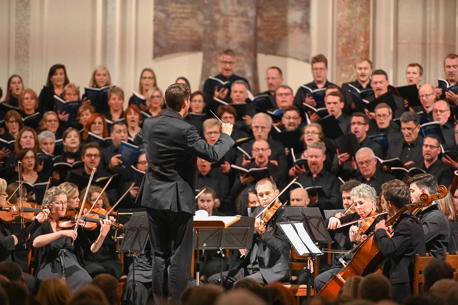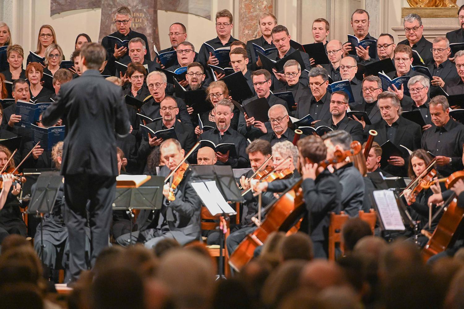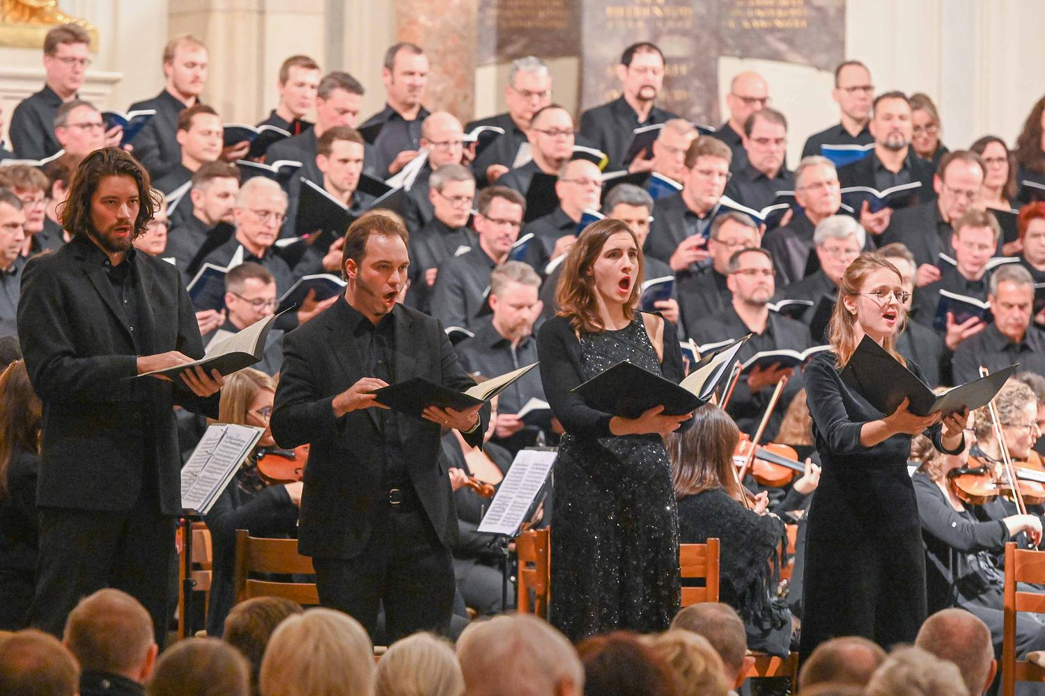 Das große Werk des Abends - das Requiem in d-moll von Wolfgang Amadeus Mozart - folgte im Anschluss in der von Franz Xaver Süßmayr im Jahre 1792 vollendeten Fassung. Zusammen mit dem beeindruckenden Projektchor aus 130 Sängerinnen und Sängern gelang es den Dirigenten Jens Paulus und Timo Reikowski eine besondere Atmosphäre zu schaffen und die Konzertbesucher auf die besinnliche Zeit des Jahres einzustimmen. Die vier Solisten Anna-Maria Wilke (Sopran), Filippa Möres-Busch (Alt), Roger Gehring (Tenor) und Christoph Schweizer (Bass) zeigten dabei ihr musikalisches Können. Zum Ausklang des Requiems läuteten die Glocken der Friedenskirche.